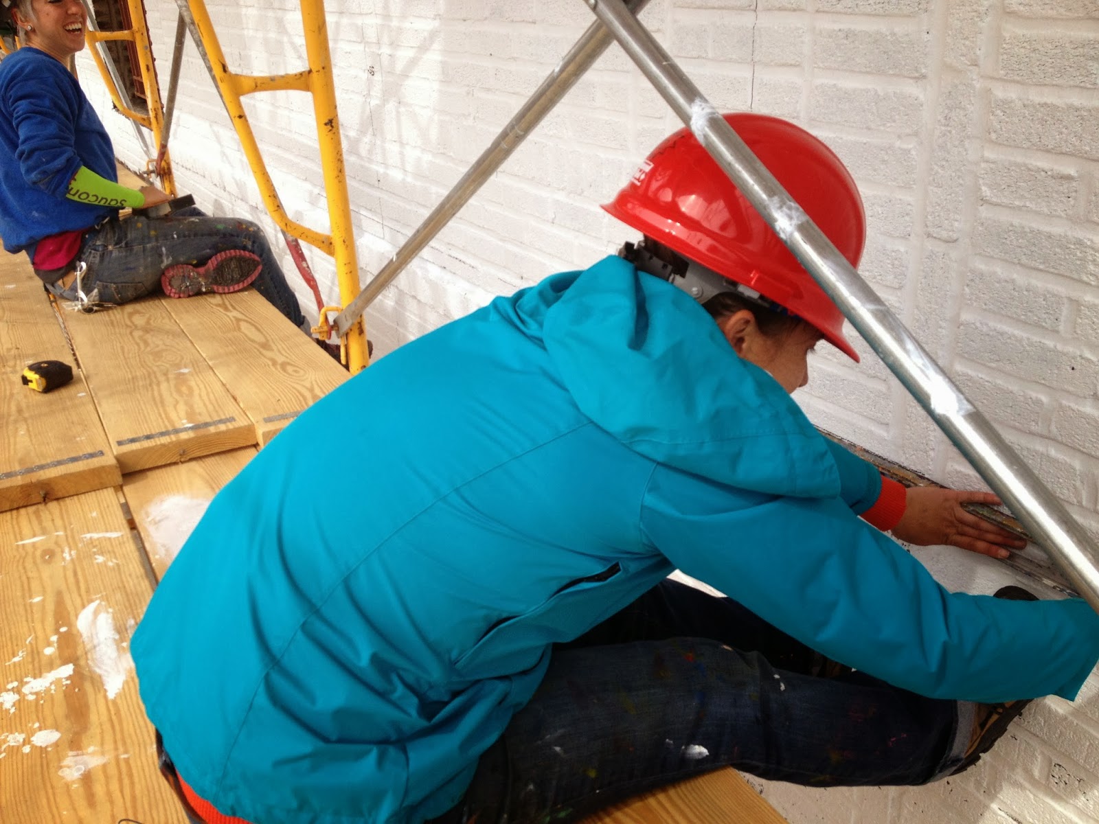 The scaffolding sits from 1.5' to 2.5' away from the wall, so you have to do some crazy moves to prevent yourself from falling sometimes. This is Erin. She's looking a little awkward but she's probably something like 6 stories off the ground only wearing a hardhat.